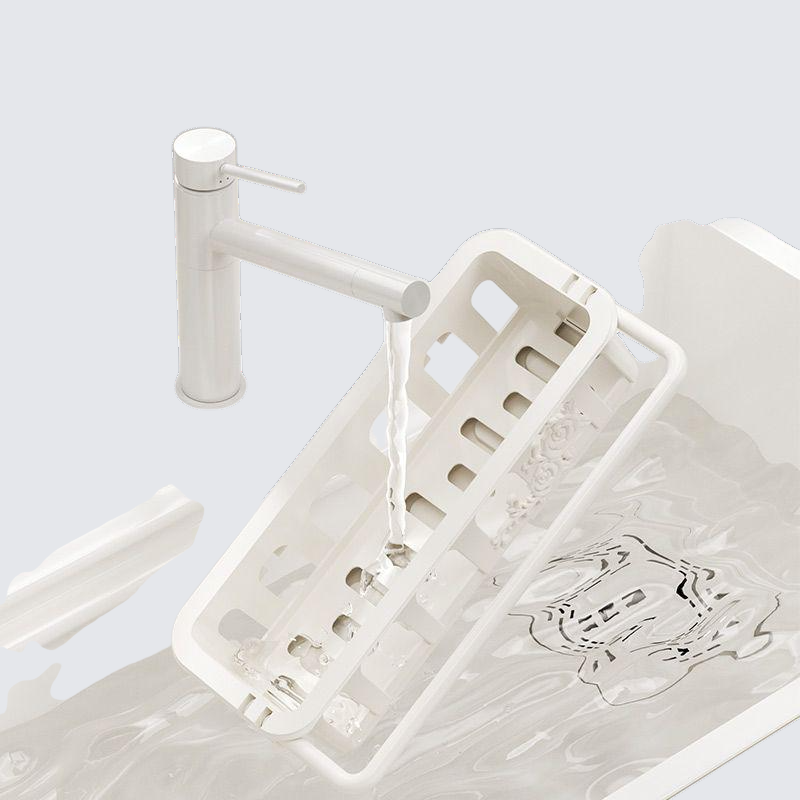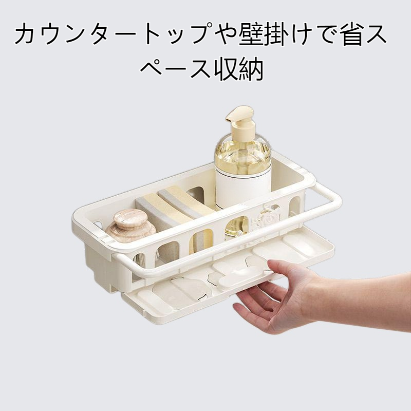 伸縮式でシンクにぴったりフィット。工具不要のパンチフリー設計。カウンタートップや壁掛けで省スペース収納。水切り機能搭載。